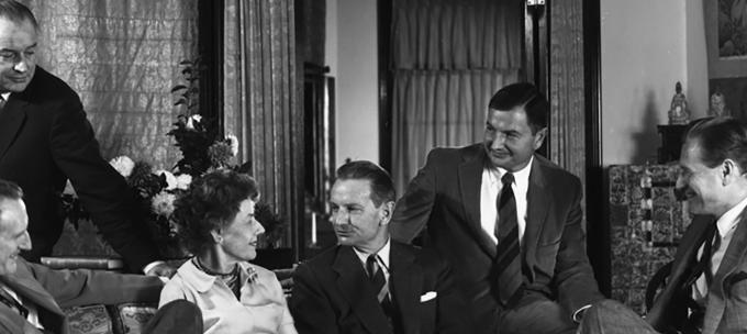 基金会创始人、洛克菲勒兄弟姊妹:左起依次为约翰•洛克菲勒三世、温思罗普、艾碧、劳伦斯、大卫和尼尔逊 (1960年)。